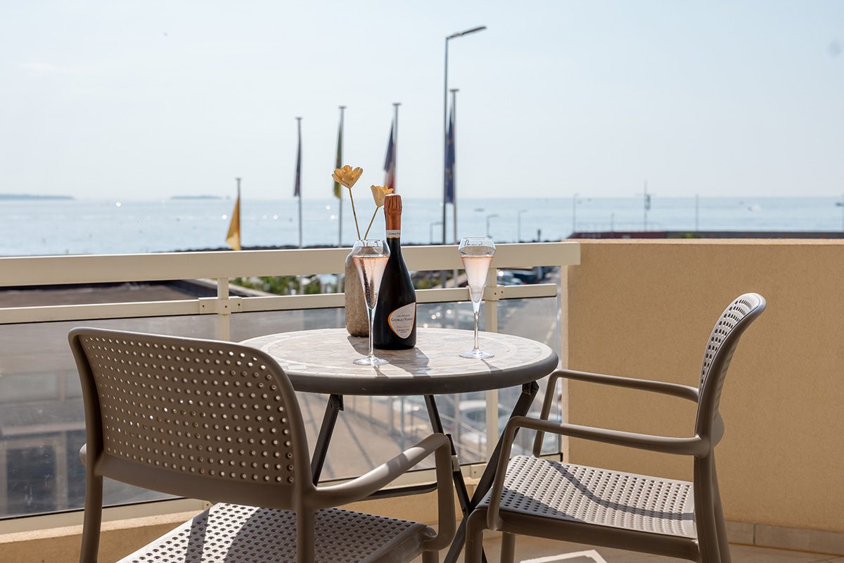 This attractively furnished 2-person sea view room with a balcony has beautiful views over the sea and marina. Besides a king-size bed, the room features a balcony, desk, flat-screen TV, fridge, individual air conditioning and Wi-Fi. The bathroom has a shower and toilet. For a family, it is possible to rent it together with the adjoining room 211.